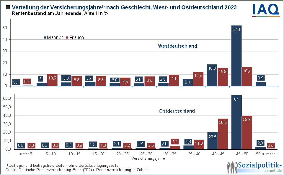Bei der Verteilung der Versichertenrenten im Bestand zeigen sich deutliche Unterschiede zwischen Ost und West. So ist der Anteil der Frauen, die nur sehr niedrige Rentenzahlbeträge erhalten, im Osten viel geringer als im Westen.