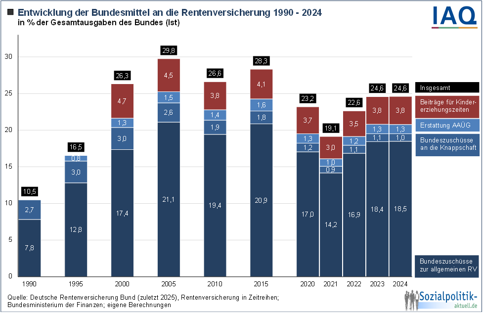 Die Ausgaben der Rentenversicherung lassen sich nicht allein über Beitragseinnahmen finanzieren, ergänzend kommt der Bundeszuschuss hinzu. Der Bundeszuschuss ist ab 1990 angehoben worden. Aktuell deckt der Bundeszuschuss knapp ein Viertel der Ausgaben der GRV ab.