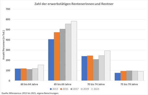 Gründe liegen in den unterschiedlichen Kohortenstärken der betreffenden Altersjahrgänge und in den steigenden Altersgrenzen für Altersrenten. Hinzu kommt: Für die Erwerbstätigkeit parallel zum Rentenbezug haben sich die rechtlichen Rahmenbedingungen verbessert.