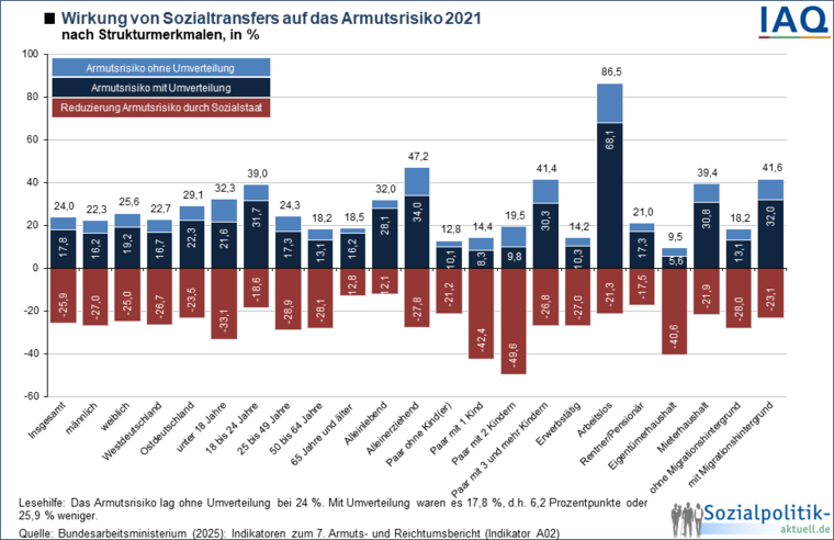 In Deutschland gilt etwa jede sechste Person (18 %) als armutsgefährdet. Arbeitslose (68 %), Alleinerziehende (34 %) und Menschen mit Migrationshintergrund (32 %) haben ein besonders hohes Armutsrisiko. Von diesen drei Gruppen profitieren lediglich Alleinerziehende mit einer Armutsreduktion von knapp 28 % leicht überdurchschnittlich von sozialstaatlichen Transferleistungen. Am stärksten wirken Sozialtransfers bei Paaren mit 2 Kindern.