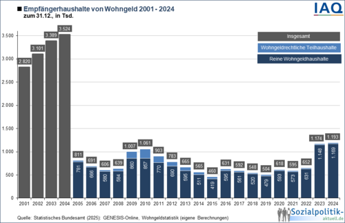 Im Jahr 2024 bezogen knapp 1,2 Millionen Haushalte Wohngeld, was einem Anstieg von 2022 auf 2024 um 85 % entsprach. Vor allem Geringverdienende, kinderreiche Familien und Rentner*innen erhalten Wohngeld. Die zunehmende Anzahl an Haushalten ist Folge von zwei Reformen – und Ausdruck des weiterhin angespannten Wohnungsmarkts.