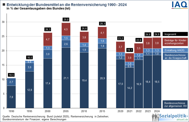 Richtig ist: 1. Der Anteil der Bundesmittel an die Rentenversicherung ist in den letzten 20 Jahren gesunken. 2. Der Anteil ist in den letzten 5 Jahren stabil und liegt im Jahr 2024 bei 24,6 % – ausgenommen das Corona-Jahr. 3. Schon seit Jahrzehnten fließen Mittel aus dem Bundeshaushalt in die gesetzliche Rentenversicherung, nämlich für allgemein gesellschaftliche Aufgaben der Rentenversicherung, die aus dem Steuertopf und nicht aus den Beiträgen der Arbeitnehmer und Arbeitgeber gezahlt werden sollen.