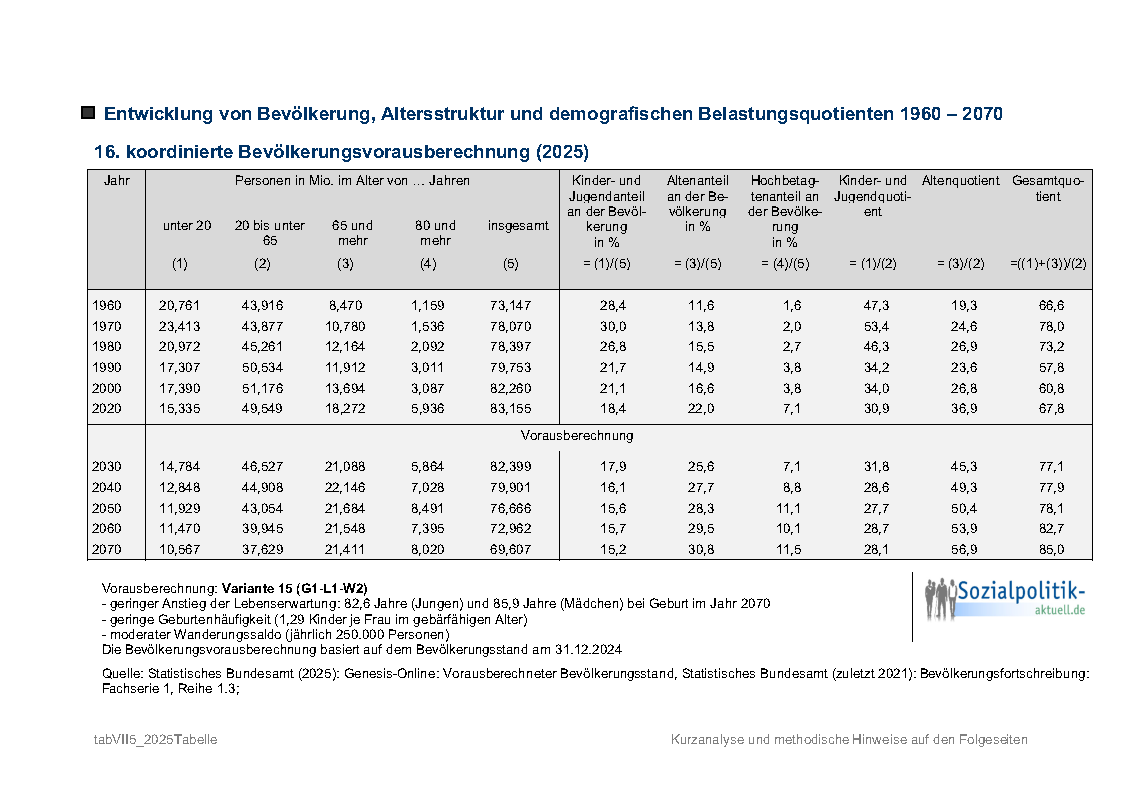 Entwicklung von Bevölkerung, Altersstruktur und demographischen Belastungsquotienten 1960 - 2070: 16. koordinierte Bevölkerungsvorausberechnung von 2025