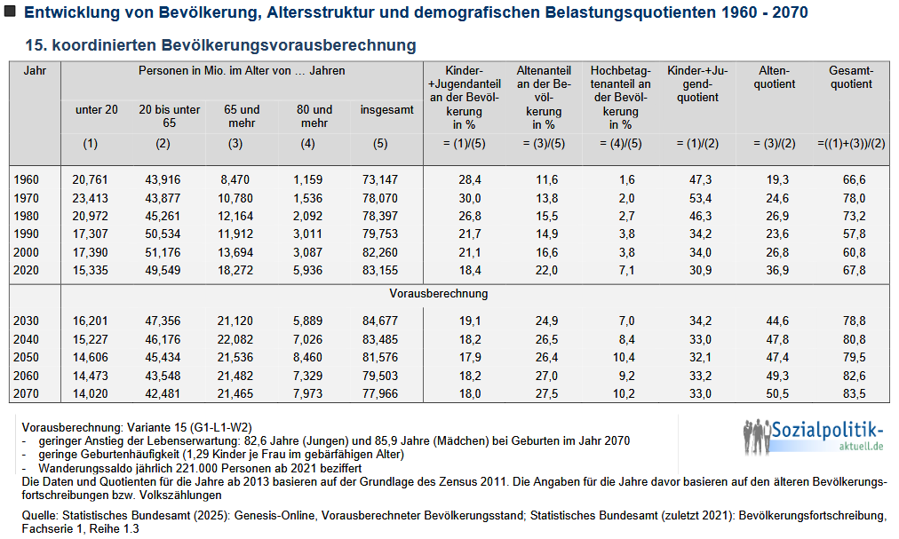 Diese Tabelle bildet Kernergebnisse der 15. Koordinierten Bevölkerungsvorausberechnung des Statistischen Bundesamts ab.